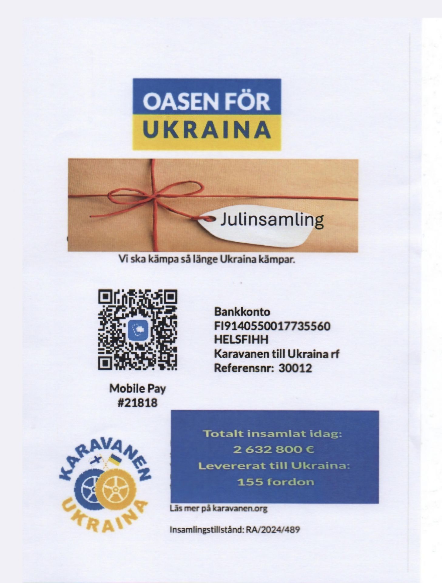 Insamlingen öppnades 26.11 på novembermötet och vi håller igång insamlingen hela december, det vi samlat till åker iväg till Ukraina med Karavanen i Januari.